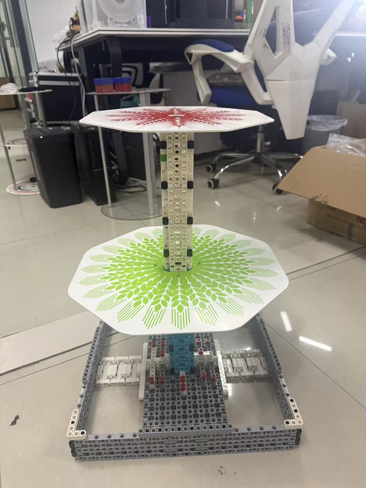 1、种植塔放置于场地中央种植塔区内,分底(正方形,边长约 370mm,四周有约50mm 高度的围栏)、中(正八边形直径<360mm,离地250mm)、顶(正八边形,直径<260mm离地 500mm)三层。
