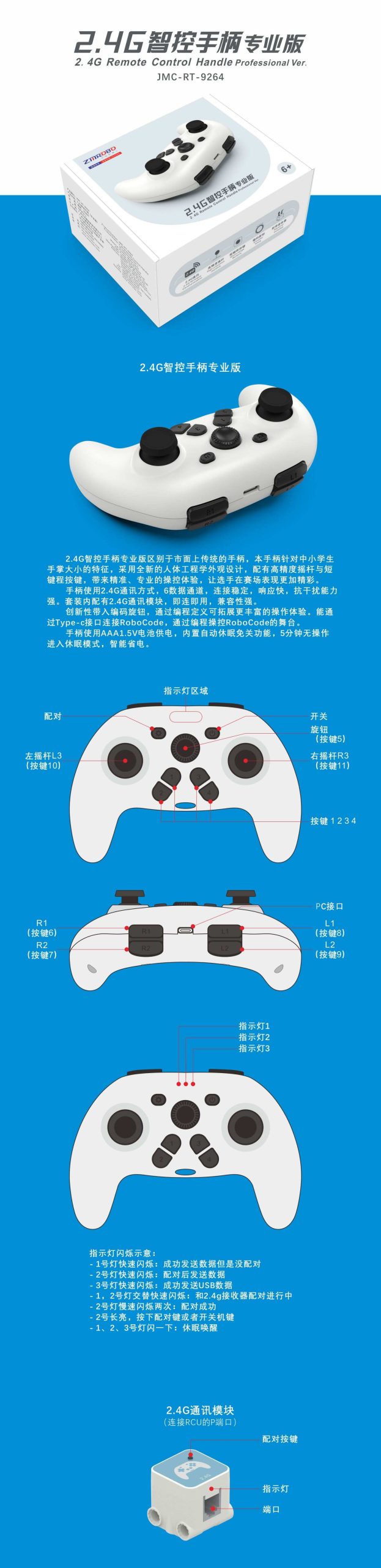 手柄参数:输入电压3V,支持无阻隔环境下直线遥控距离大于10米;内置2.4G通讯模块,支持6数据通道,连接稳定;。支持使用两1.5V(AAA) 电池供电;支持5分钟无操作进入休眠状态;