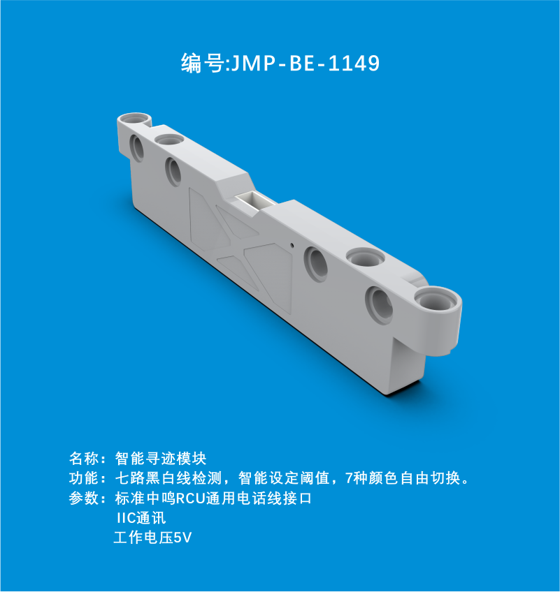 工作电压5V;3、可以切换7种不同的颜色,具有一定抗环境光的功能;4、内置蜂鸣器;5、具备自动设置参考与手动设定参考值功能,可以读取每路传感器的模拟数值和与参考值的判断值;6、具有高速I2C接口,支持固件升级;7、模块高度为板顶离地面14mm,不要高于30mm。
