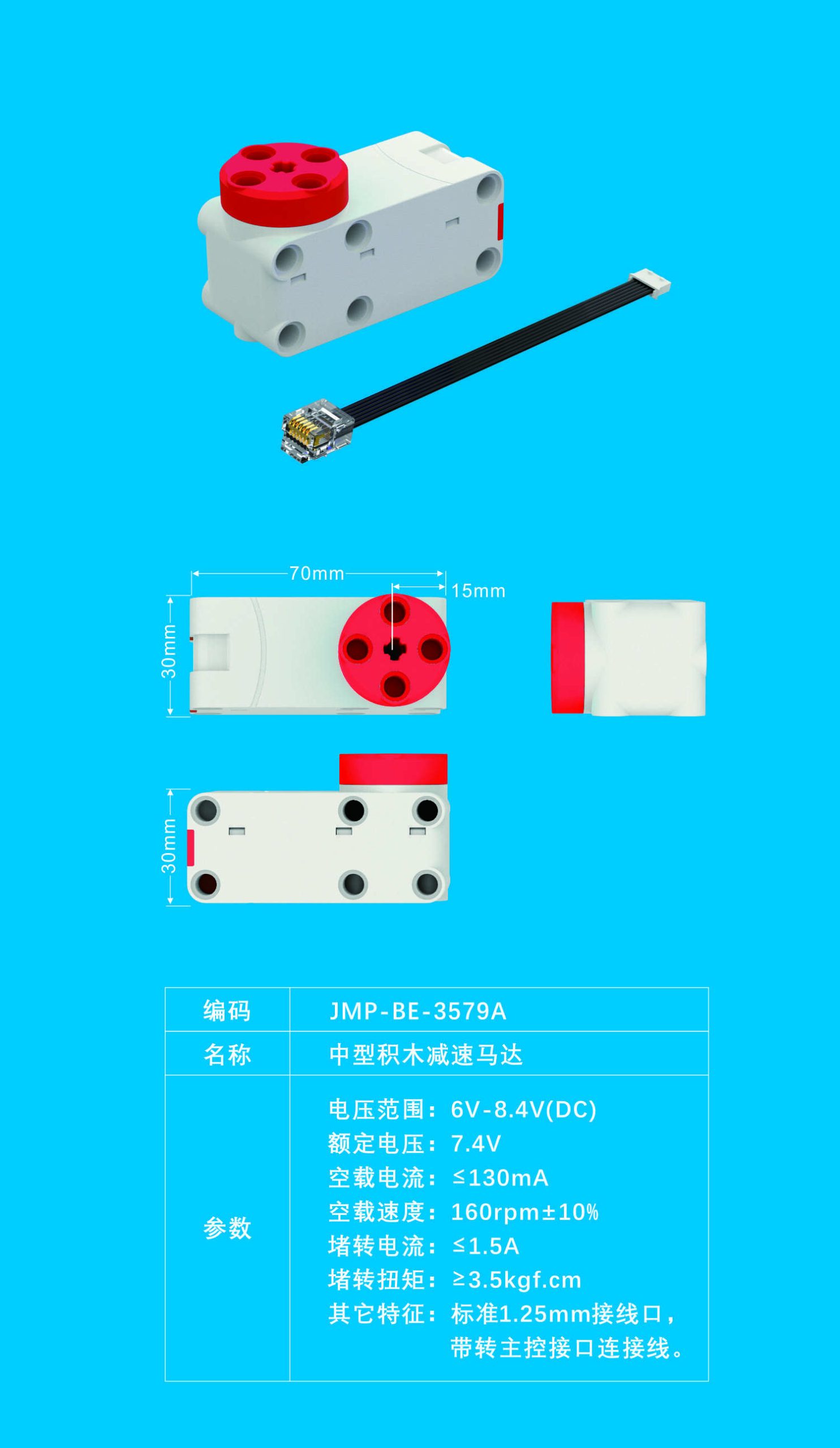 电压范围:6V-8.4V(DC) 额定电压:7.4V 空载电流:≤130mA 空载速度:160rpm+10% 堵转电流:≤1.5A 堵转扭矩:>3.5kgf.cm 其它特征:标准1.25mm接线口,带转主控接口连接线。